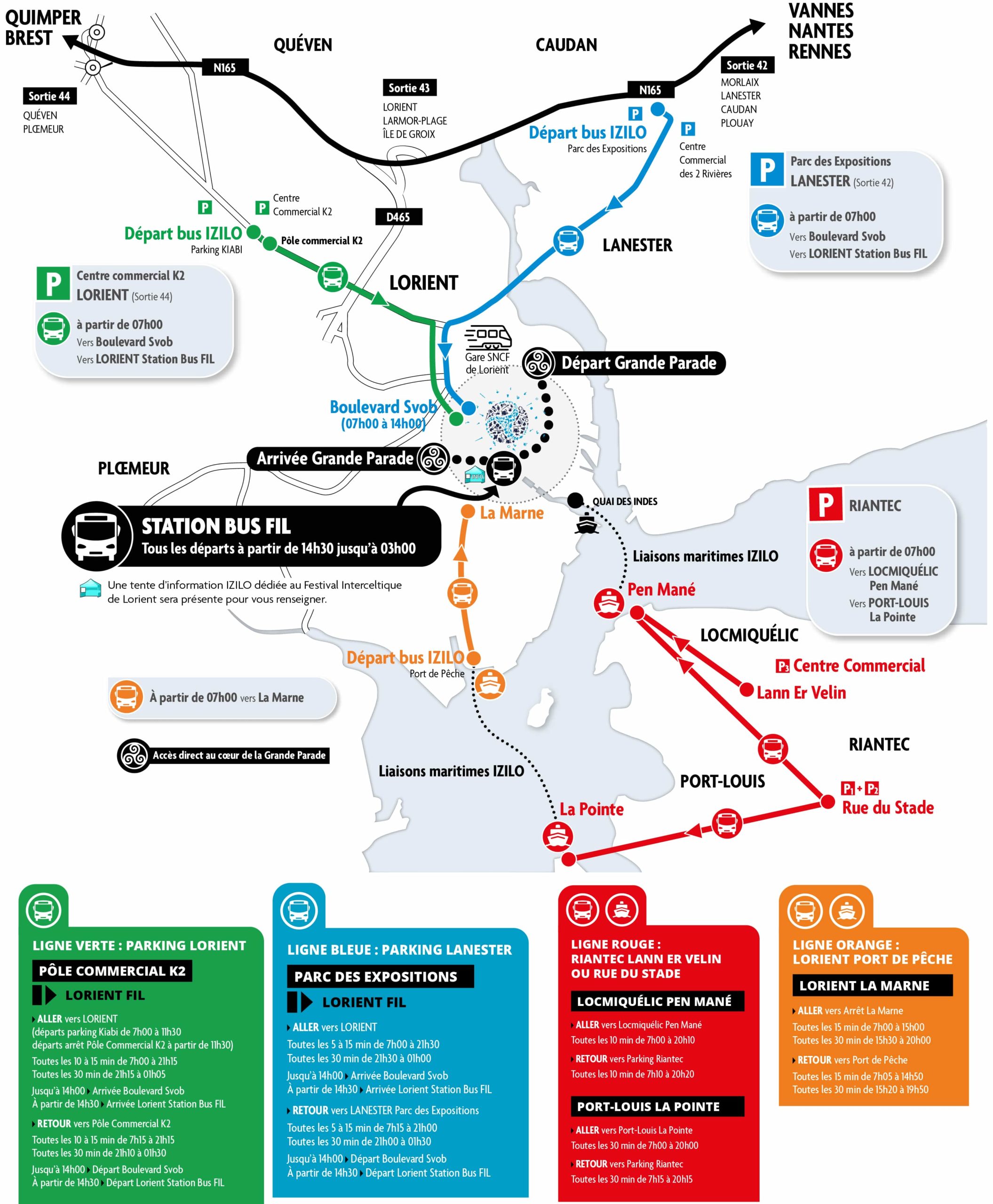 Si vous venez en voiture, un parking relais est situé au Parc des Expositions à Lanester pour faciliter votre stationnement. L’accueil de votre véhicule se fait jusqu’à 1h du matin et le retrait 24h/24. Rejoignez directement le Festival Interceltique de Lorient avec les lignes de bus.