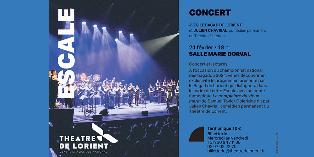 À l’occasion du championnat national des bagadoù 2024 venez découvrir en exclusivité le programme présenté par le Bagad de Lorient qui dialoguera dans le cadre de cette Escale avec un conte fantastique La complainte du vieux marin de Samuel Taylor Coleridge dit par Julien Chavrial, comédien permanent du Théâtre de Lorient.