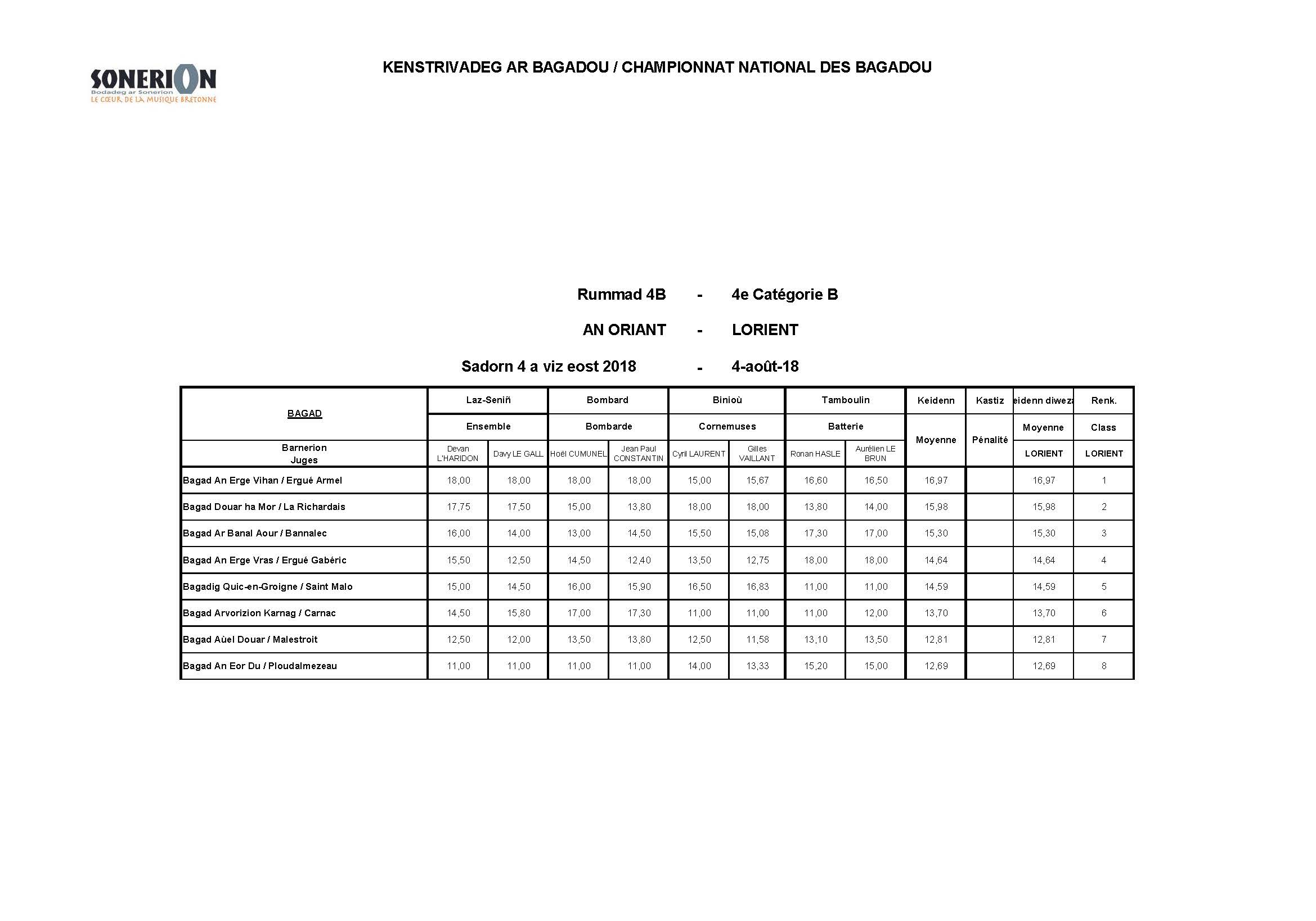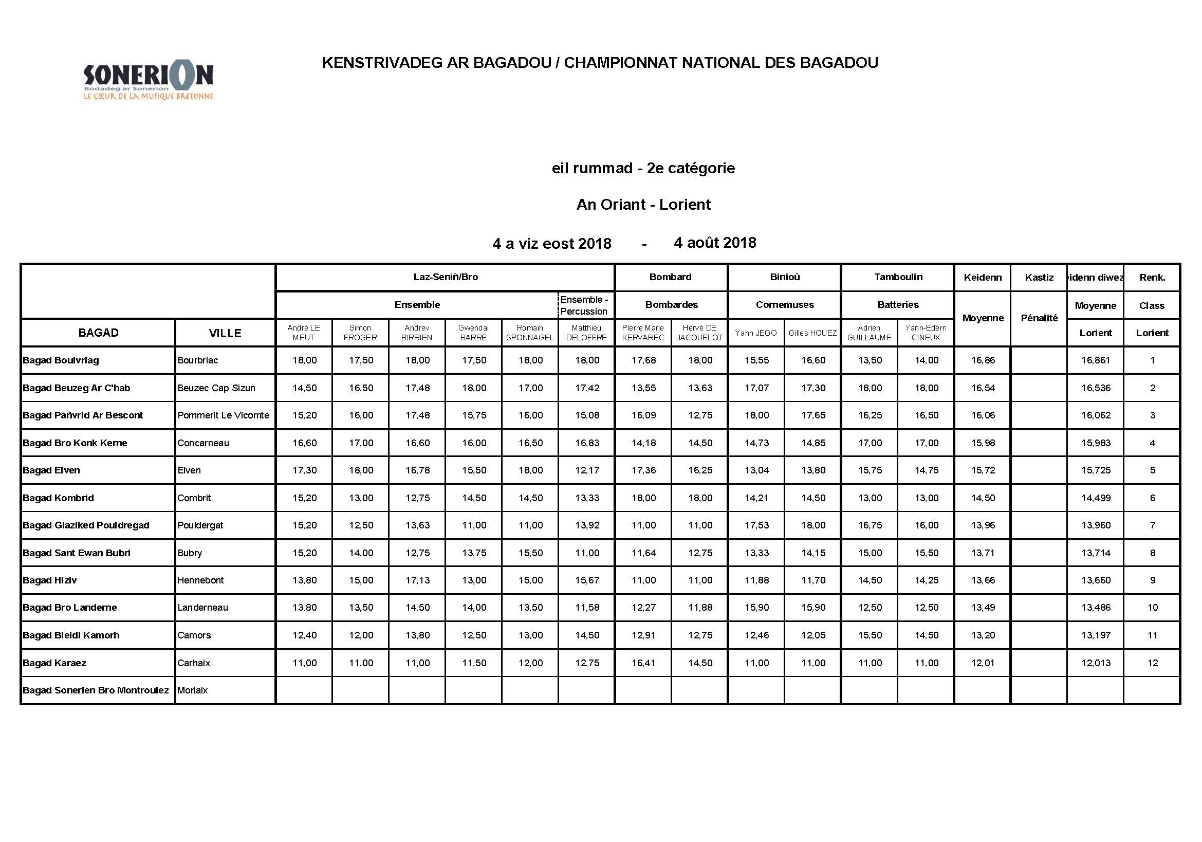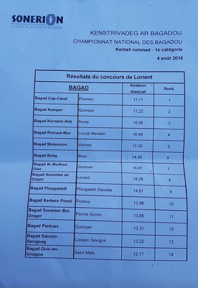 La deuxième manche du Championnat National des Bagadoù organisé par Sonerion au Festival Interceltique de Lorient se termine et consacre le Bagad Cap Caval en tant que champion de Lorient (le championnat étant exceptionnellement diviser en deux manches distinctes). Le Bagad Cap Caval remporte donc les deux manches.
