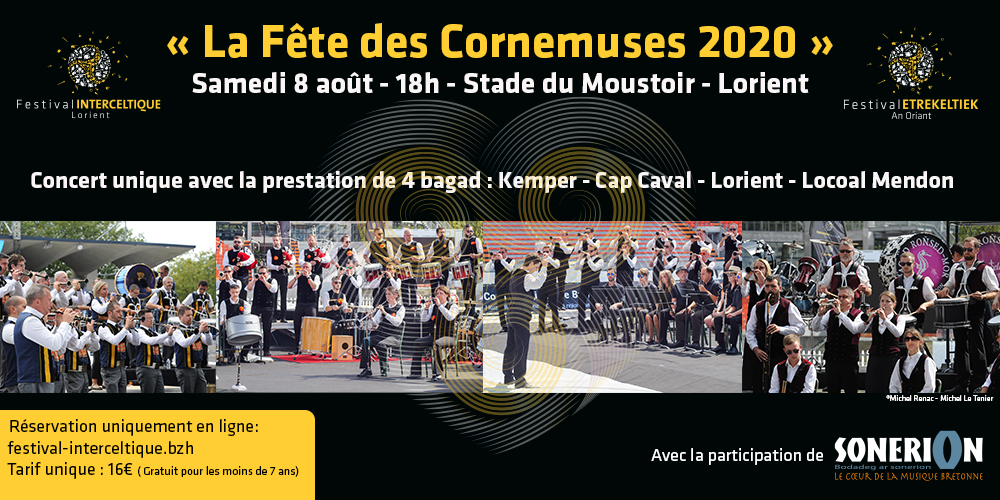 Cependant et à mesure que les conditions du déconfinement ont permis l’autorisation de certaines manifestations, sous des conditions sanitaires très précises, nous nous sommes décidés à préparer un concert unique pour rappeler que le FIL est toujours là et que nous travaillons avec énergie, détermination et enthousiasme pour que la célébration des 50 ans du Festival en 2021 soit une grande fête. Aussi, en accord avec les autorités, l’accompagnement de la municipalité et la coopération chaleureuse de Sonerion – la fédération des sonneurs bretons -, nous avons le plaisir de vous proposer un concert de bagadoù au stade du Moustoir le 8 Août à partir de 18 heures. A l’affiche 4 bagad de haut niveau : le Bagad Quimper, le plus titré de Bretagne, Cap Caval, le bagad qui a remporté la plupart des championnats depuis une dizaine d’années, le bagad Ronsed Mor de Locoal Mendon et le Bagad de Lorient.